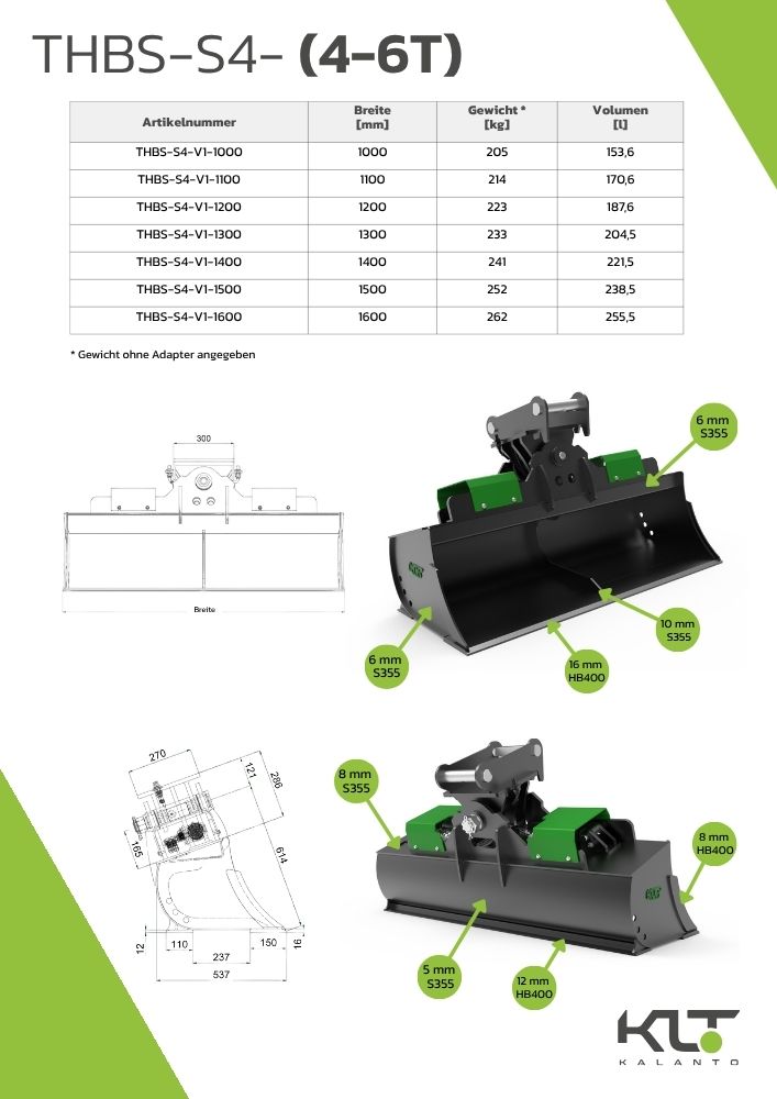 Das Modell THBS-S4-V1-1600-S45-RB ist ein besonders stabiler, hydraulisch Schwenklöffel für Bagger der 4–6-Tonnen-Klasse, ausgelegt für Arbeiten in schwerem Gelände. Durch den Einsatz zweier Hydraulikzylinder gewährleistet er eine konstante Kraftübertragung und ein sicheres Schwenkverhalten selbst unter hoher Last. Die hintere Planierklinge ermöglicht schnelles und effizientes Einebnen beim Rückwärtsfahren und steigert so die Gesamtarbeitsleistung.