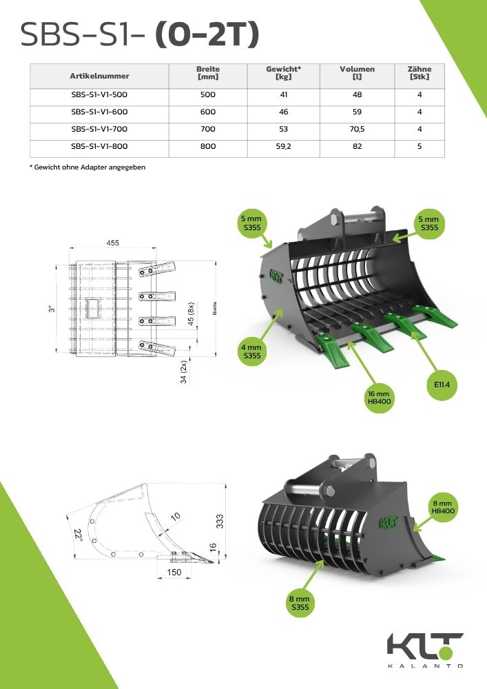 Das Modell SBS-S1-V1-800-S30/150 ist ein langlebiger und funktionaler Sieblöffel für Minibagger und kompakte Maschinen bis zu 2 Tonnen. Der offener Rippenboden ermöglicht ein effizientes und gleichmäßiges Sieben des Materials, wodurch er sich ideal zur Trennung von Steinen, Schutt und unerwünschten Fraktionen bei Erdarbeiten eignet. Durch seine robuste Konstruktion und den Einsatz verschleißfester Stähle bietet der Löffel eine hohe Lebensdauer und zuverlässige Leistung im täglichen Einsatz.