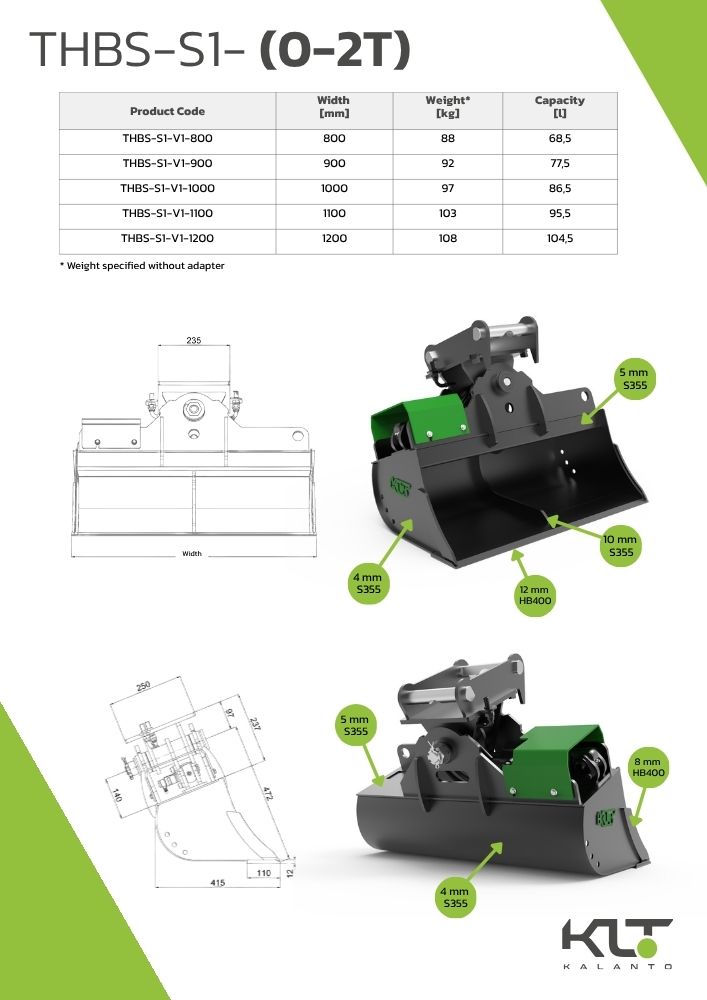 The THBS-S1-V1-1000-MS01SY hydraulic tilt bucket is designed for precise terrain shaping, slope profiling and ditch cleaning with mini excavators up to 2 tons. Equipped with a hydraulic cylinder, it allows the operator to adjust the working angle, significantly increasing versatility and comfort—especially in tight spaces and uneven terrain.