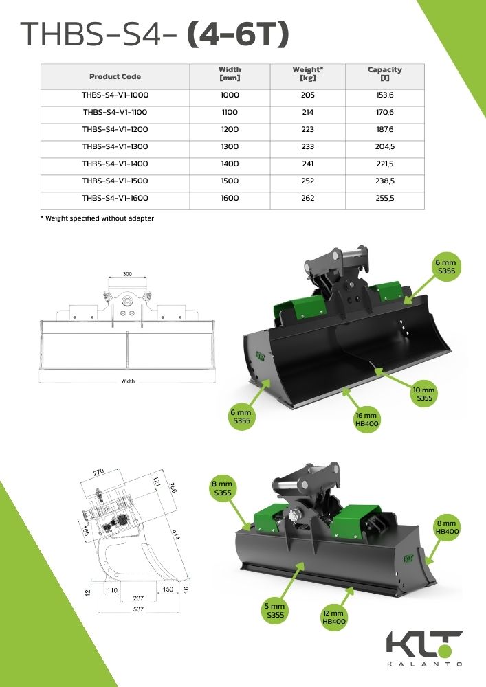 The THBS-S4-V1-1600-S45-RB is a robust hydraulic tilting grading bucket developed for excavators in the 4–6 ton range, specifically for demanding terrain operations. With two hydraulic cylinders, it provides stable tilting performance and consistent force distribution under load. The rear blade allows fast and efficient leveling while reversing, boosting overall work efficiency. The bucket’s structure is made from hardened, wear-resistant materials, ensuring durability and dependable performance during prolonged and intensive use.