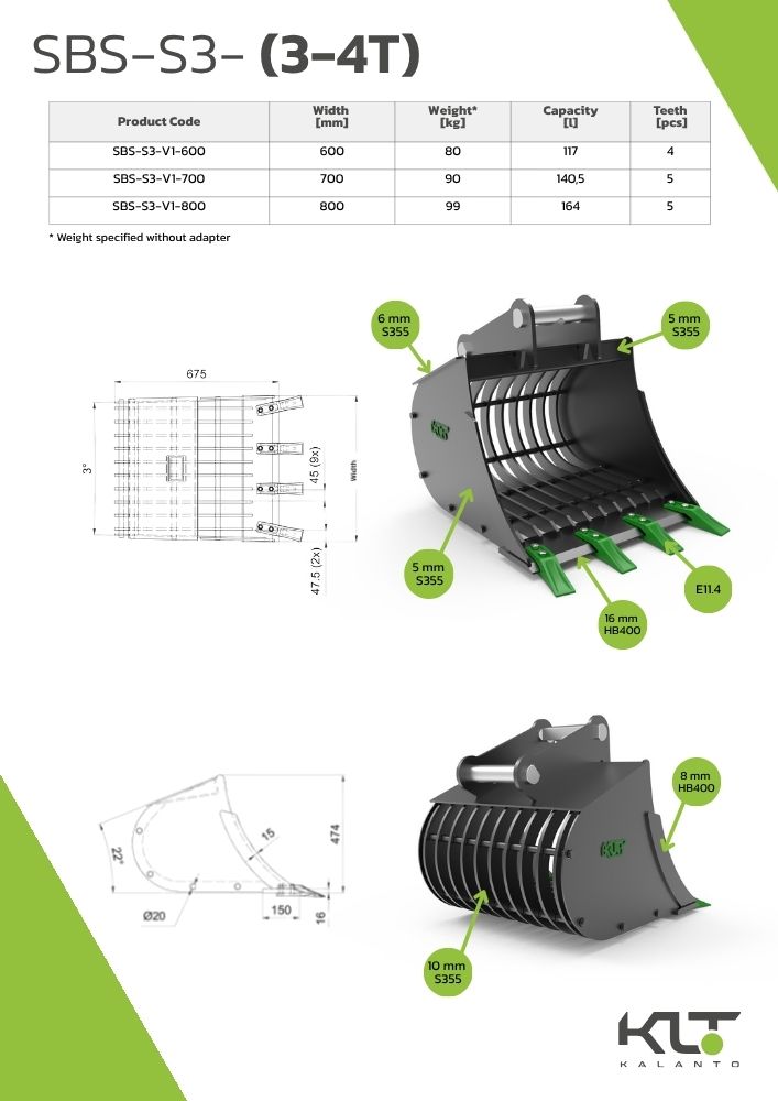 The SBS-S3-V1-600-S40 model is a robust skeleton bucket designed for 3–4-ton excavators, created to ensure efficient screening and sorting of loose materials. Precisely positioned ribs allow for effective separation of soil from larger fractions without the need for additional tools. It performs exceptionally well when removing stones, rubble, roots or other unwanted elements from the excavated material. Thought-out geometry ensures easy filling and fast emptying, which noticeably enhances overall productivity.