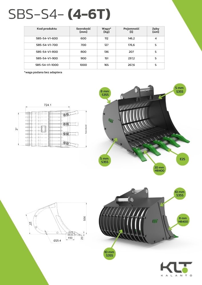Model SBS-S4-V1-600-S40 to trwała łyżka ażurowa dedykowana koparkom o masie 4–6 ton, idealna do zadań wymagających precyzyjnego przesiewania i separacji urobku. Jej wzmocniona, otwarta konstrukcja ułatwia oddzielanie ziemi od kamieni, gruzu czy organicznych frakcji. Dzięki przemyślanej geometrii oraz lekkiej, lecz solidnej budowie, łyżka umożliwia zachowanie wysokiego tempa pracy przy jednoczesnej dokładności procesu przesiewania, co ma kluczowe znaczenie w robotach ziemnych i porządkowych.