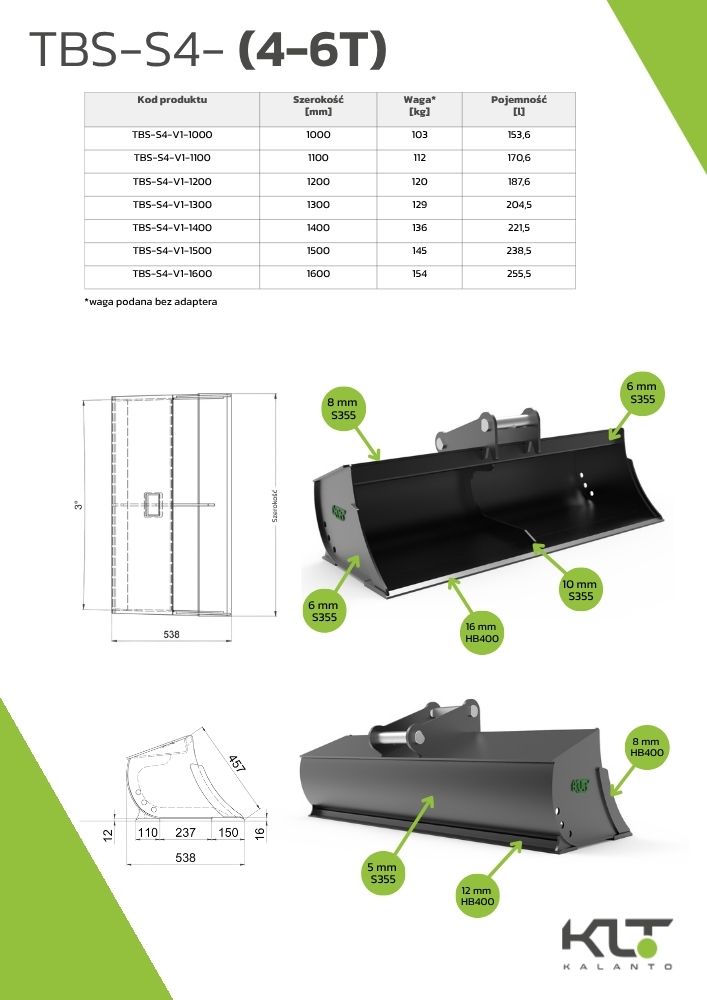 Łyżka TBS-S4-V1-1600-MS03SY-RB została skonstruowana z myślą o wymagających operatorach, którzy potrzebują maksymalnej efektywności przy pracy koparkami o masie 4–6 ton. Dzięki zwiększonej szerokości roboczej idealnie nadaje się do wyrównywania większych powierzchni, kształtowania skarp, utrzymania rowów oraz prac porządkowych na rozległych placach budowy. Głęboka i szeroka czasza w połączeniu z łagodnym promieniem zakrzywienia pozwala na szybkie i dokładne rozprowadzanie ziemi lub kruszywa.