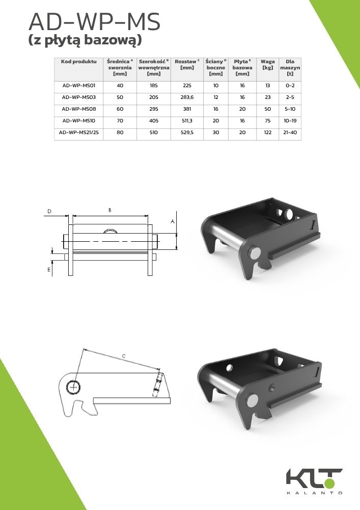 Adapter AD-WP-MS01 to wytrzymałe rozwiązanie zgodne ze standardem Lehnhoff MS01, wyposażone w solidną płytę bazową. Umożliwia szybkie i stabilne montowanie osprzętu w lekkich i kompaktowych maszynach, zapewniając płynność pracy oraz maksymalną efektywność na placu budowy.