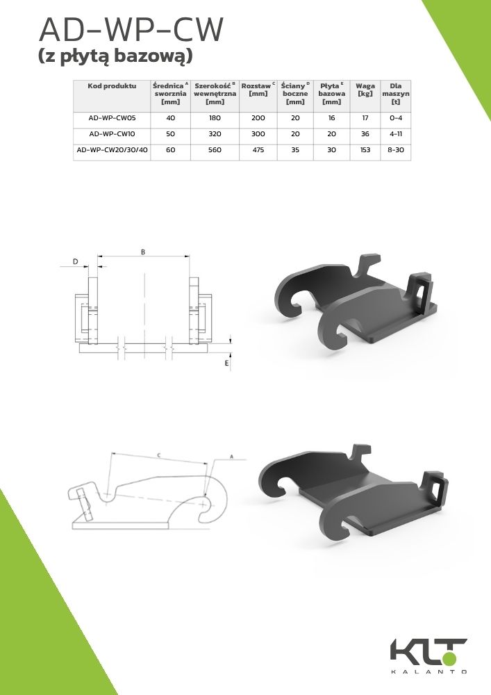 AD-WP-CW20/30/40 to wzmocniony adapter odpowiadający dużym standardom Verachtert CW, dostosowany do cięższego sprzętu i wymagającej pracy. Płyta bazowa zwiększa wytrzymałość konstrukcji, a precyzyjne dopasowanie pozwala na pewne i stabilne przenoszenie sił podczas obsługi dużego osprzętu.